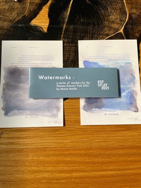 Watermarks is an actual manifestation of extracts of Tom King’s Thames Estuary Trail: a Walk Round the End of the World, mapping it in a tangible way across the estuary, whilst simultaneously chronicling some of Maria Amidu’s laugh out loud moments when she was reading the book. Maria is also using the chromatic language of each of the eight sites along the walk and their immediate surroundings as her palette for Watermarks, adding another layer to her blending of text with landscape. The idea for Watermarks evolved out of these tongue in cheek words from Tom at the bottom of page 43 (of the first edition) of said book: In 1791, Will [Waight] was buried in Hockley churchyard, about four miles to the north of the Estuary. He lies at his own request, just outside the porch-door… “People have trampled all over me in life, so they might as well do so in death as well”, he declared, sourly.... “Get people to walk all over your memory. That’s the key to immortality,” I told the dog.